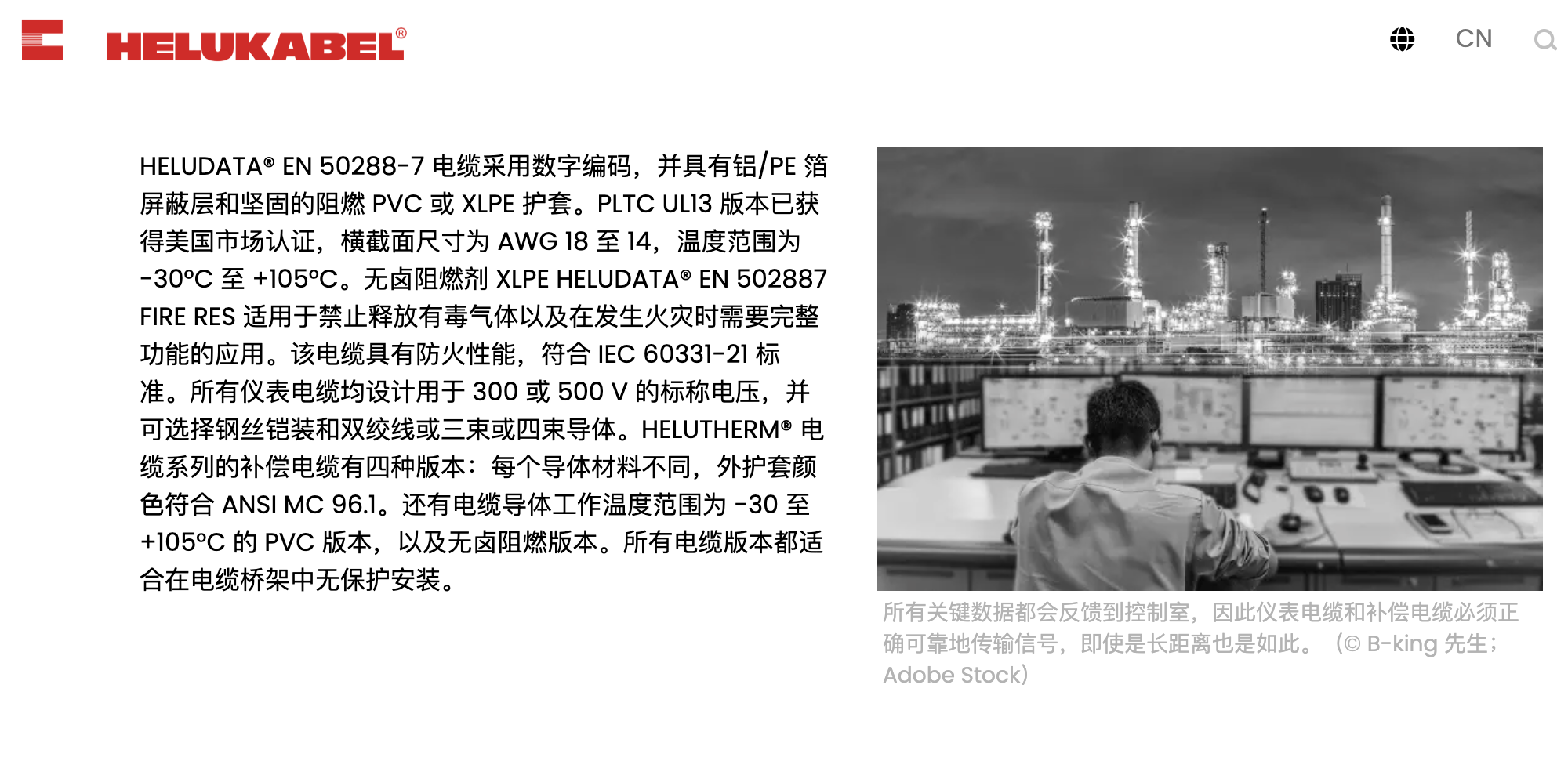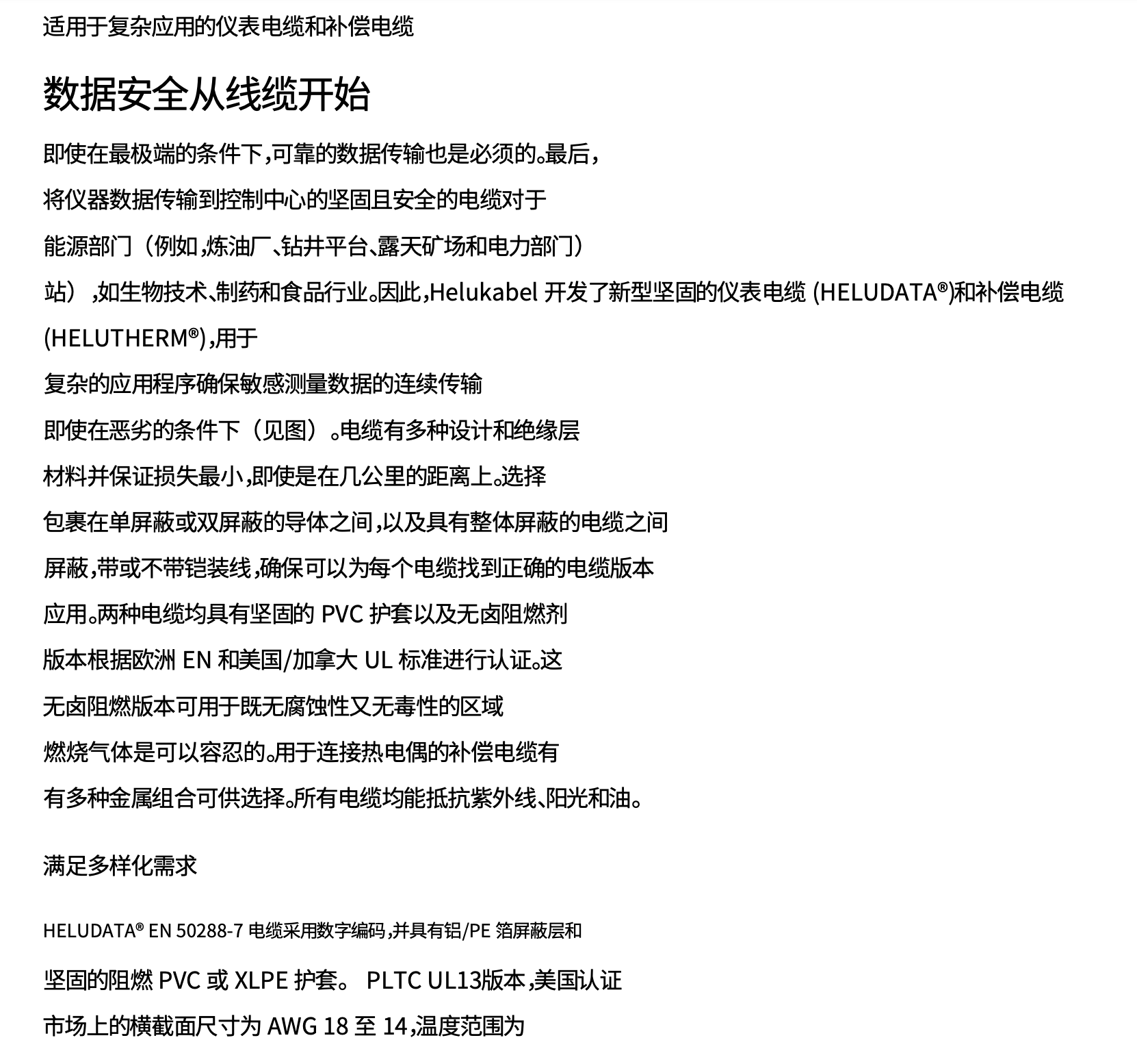 即使在最极端的条件下,可靠的数据传输也是必须的。因此,将仪器数据传输到控制中心的坚固且安全的电缆在能源领域(例如炼油厂、钻井平台、露天矿井和发电站)与生物技术、制药和食品行业同样重要。因此,Helukabel 开发了新型坚固的仪表电缆 (HELUDATA ®)和补偿电缆(HELUTHERM®)适用于复杂的应用,以确保即使在恶劣条件下也能连续传输敏感的测量数据(见图)。这些电缆采用各种设计和绝缘材料,即使在几公里的距离内,也能保证最小的损耗。在单屏蔽或双屏蔽包裹的导体以及带有整体屏蔽(带或不带钢丝铠装)的电缆之间进行选择,可确保为每种应用找到正确的电缆版本。两种带有坚固 PVC 护套的电缆及其无卤阻燃版本均经过欧洲 EN 和美国/加拿大 UL 标准认证。无卤阻燃版本可用于既不能容忍腐蚀性气体也不能容忍有毒燃烧气体的区域。用于连接热电偶的补偿电缆有多种金属组合可供选择。所有电缆均能抵抗紫外线、阳光和油。