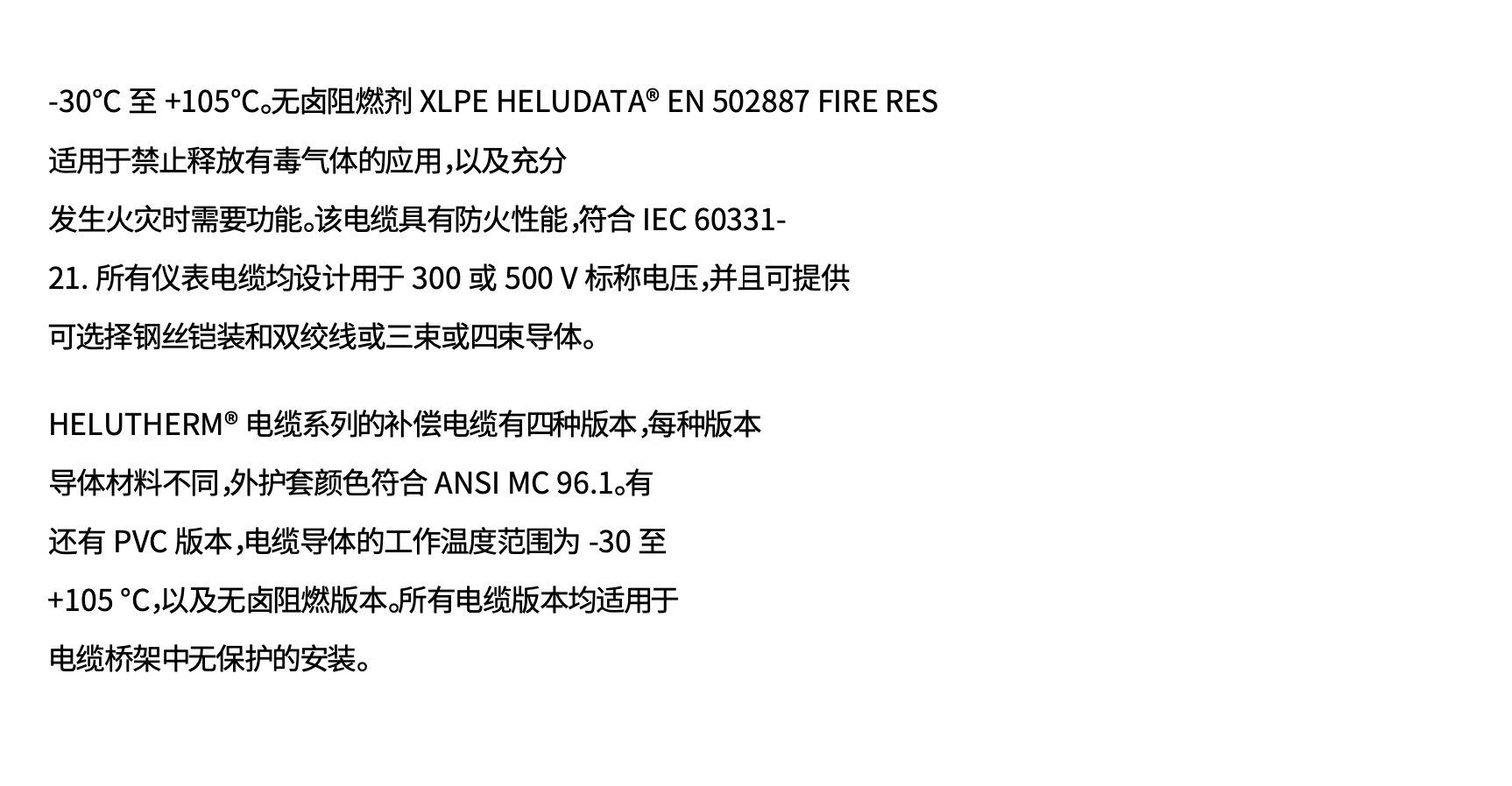 即使在最极端的条件下,可靠的数据传输也是必须的。因此,将仪器数据传输到控制中心的坚固且安全的电缆在能源领域(例如炼油厂、钻井平台、露天矿井和发电站)与生物技术、制药和食品行业同样重要。因此,Helukabel 开发了新型坚固的仪表电缆 (HELUDATA ®)和补偿电缆(HELUTHERM®)适用于复杂的应用,以确保即使在恶劣条件下也能连续传输敏感的测量数据(见图)。这些电缆采用各种设计和绝缘材料,即使在几公里的距离内,也能保证最小的损耗。在单屏蔽或双屏蔽包裹的导体以及带有整体屏蔽(带或不带钢丝铠装)的电缆之间进行选择,可确保为每种应用找到正确的电缆版本。两种带有坚固 PVC 护套的电缆及其无卤阻燃版本均经过欧洲 EN 和美国/加拿大 UL 标准认证。无卤阻燃版本可用于既不能容忍腐蚀性气体也不能容忍有毒燃烧气体的区域。用于连接热电偶的补偿电缆有多种金属组合可供选择。所有电缆均能抵抗紫外线、阳光和油。