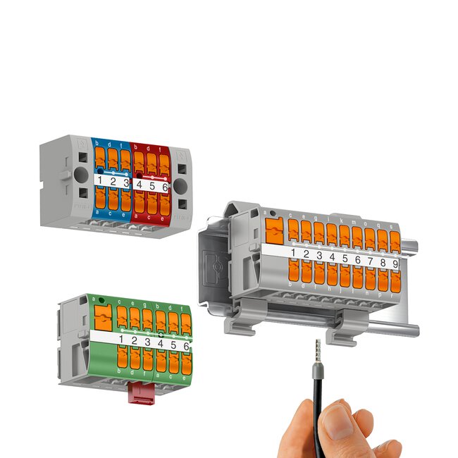 这意味着配电块是世界各地应用中使用的具有横向螺钉连接的端子块的替代品。这些块上的标记也更清晰、更容易阅读。通过直插式连接,无需工具即可立即接触导体。特殊的接触弹簧可以轻松插入并保证高水平的接触质量。